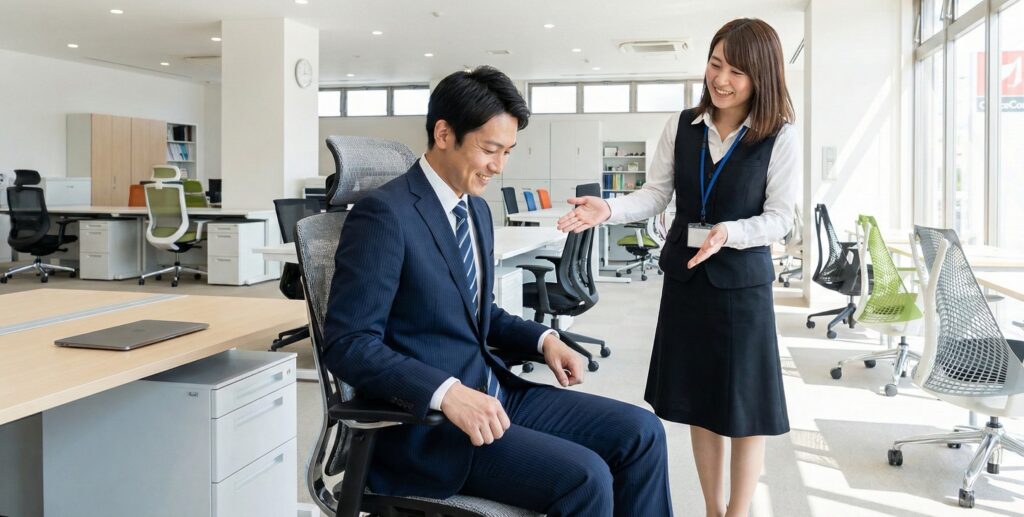 (画像挿入: オフィスコムのショールームで、スタッフが顧客にチェアの説明をしているシーン。明るく清潔感のある店内)