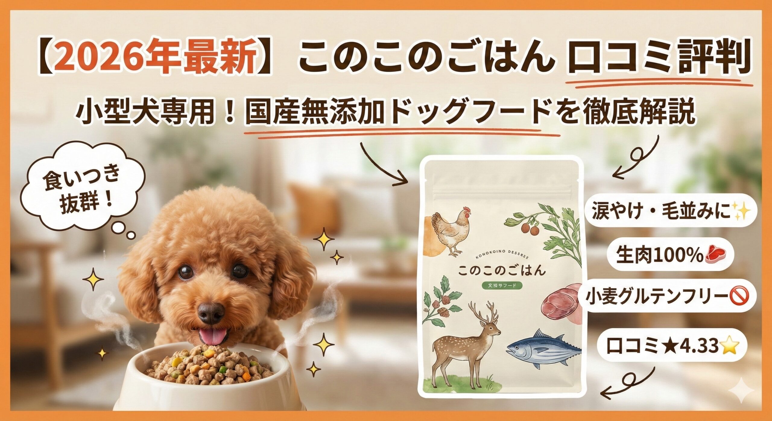 このこのごはんは、小型犬専用の国産無添加ドッグフードです。生肉100%使用、小麦グルテンフリーで、愛犬の健康と食いつきの両方にこだわっています。