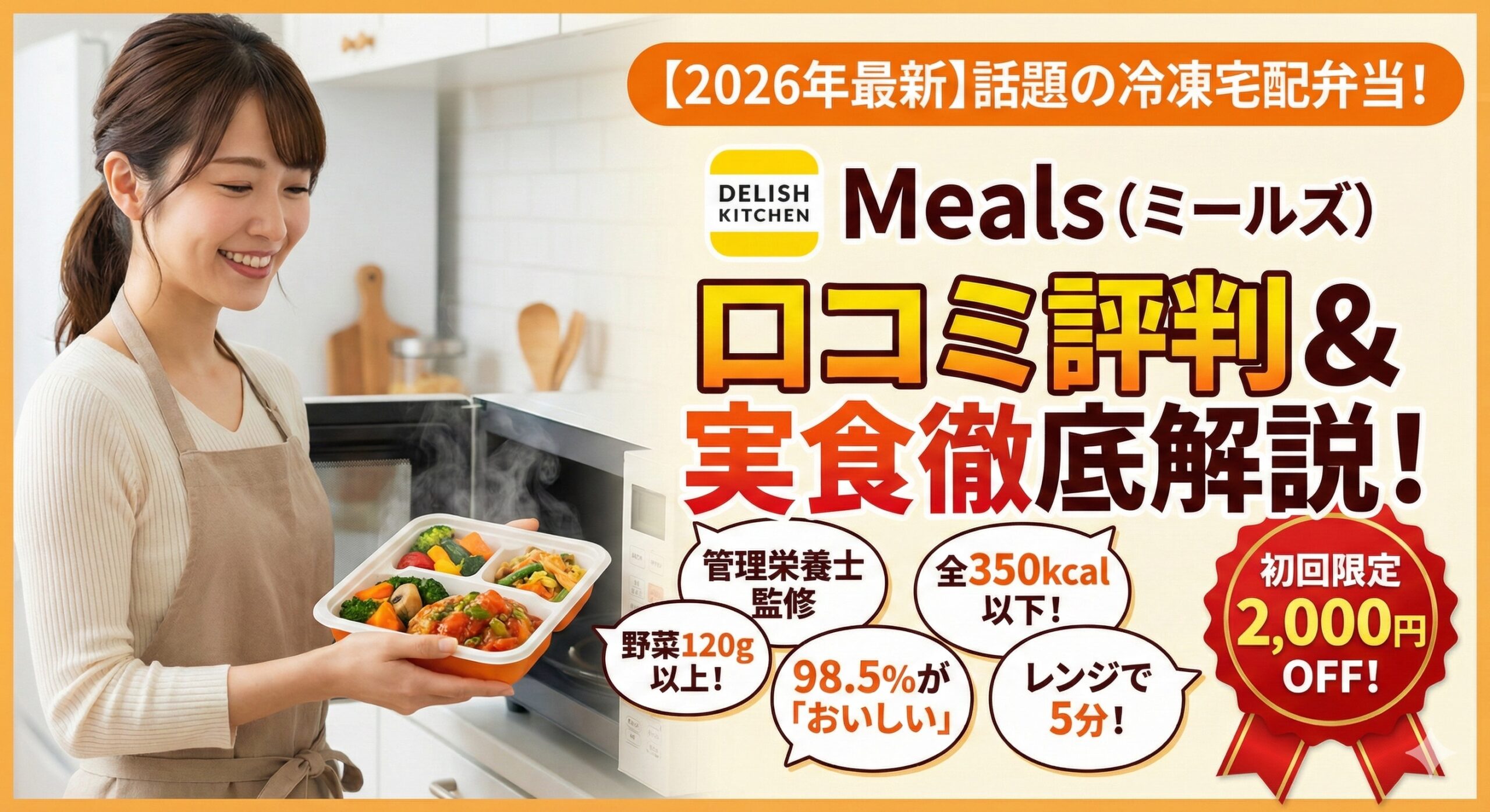 DELISH KITCHENがプロデュースする宅配弁当「Meals(ミールズ)」は、管理栄養士監修で全メニュー350kcal以下・野菜120g以上という栄養バランスと、98.5%が「おいしい」と評価する味を両立した冷凍弁当サービスです。