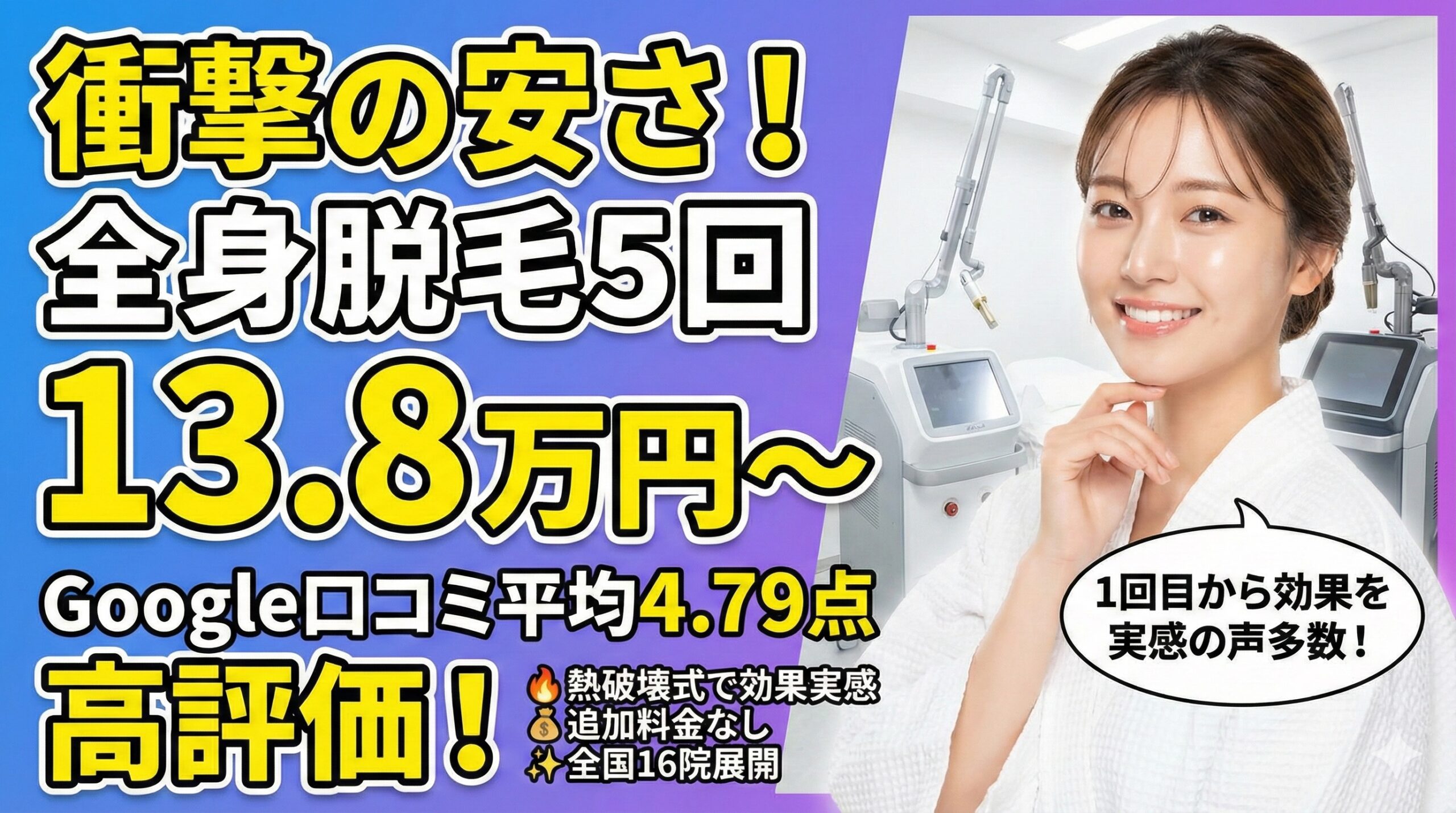 全国16院展開の医療脱毛専門クリニックで、全身脱毛5回138,000円〜という低価格が魅力。Google口コミでは平均4.79点の高評価を獲得し、「1回目から効果を実感できた」という声が多数寄せられています。