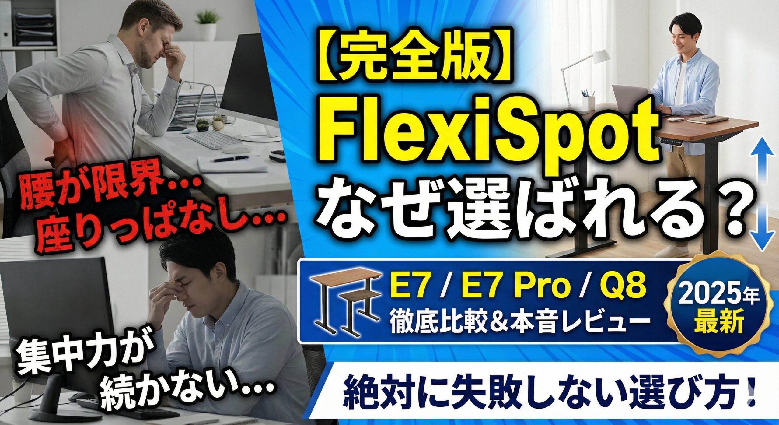 この記事では、FlexiSpotの主要モデル(E7, E7 Pro, E8, Q8)を徹底比較し、メリット・デメリット、そして「絶対に失敗しない選び方」を1万文字を超えるボリュームで完全解説します。