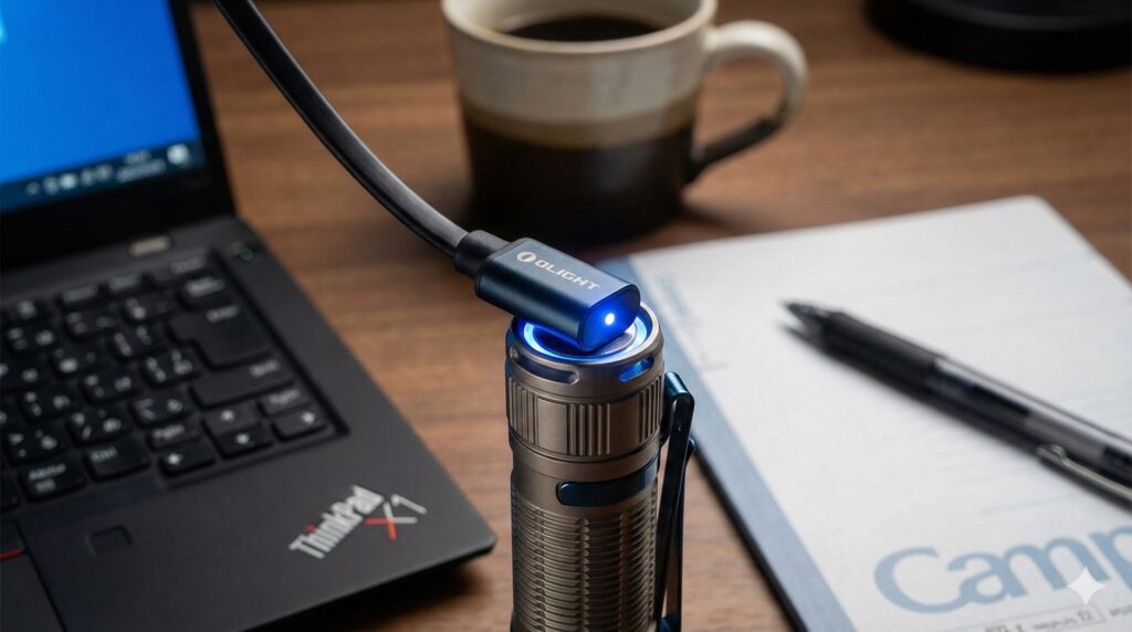 Olightの多くのモデルは、テール(お尻)部分に磁石が入っており、専用ケーブルを近づけるだけで「パチッ」と吸着して充電が始まります。