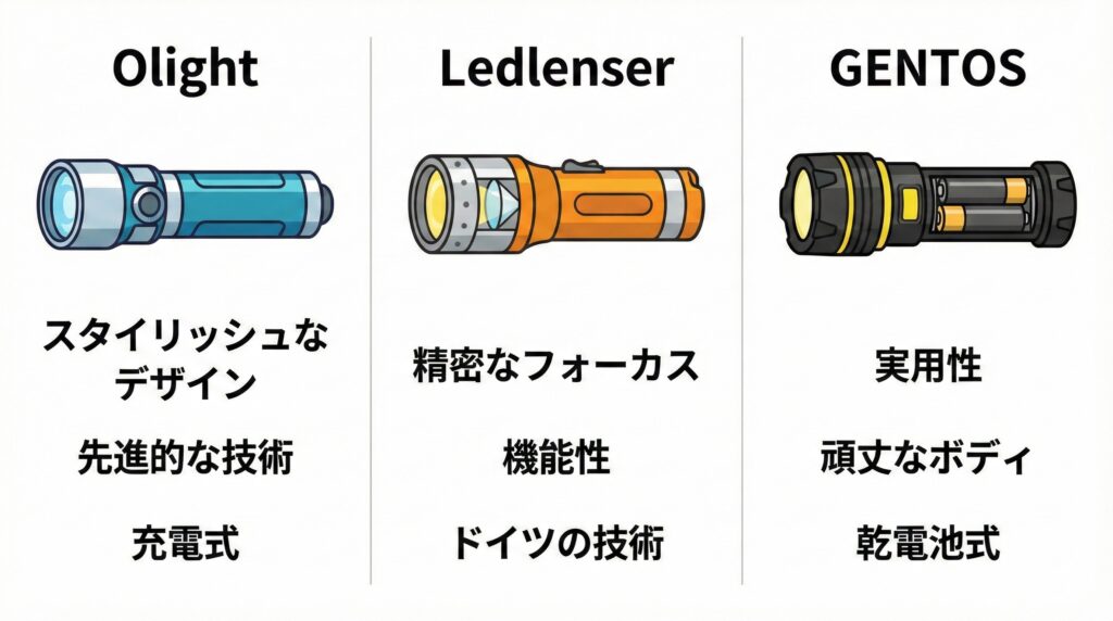 | 項目 | Olight (オーライト) | Ledlenser (レッドレンザー) | GENTOS (ジェントス) |