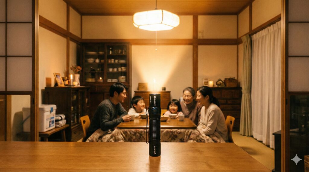 停電時、Olightは「ランタン」代わりになります。光を天井に当てて反射させる(天井照射)だけで、部屋全体が柔らかく明るくなります。