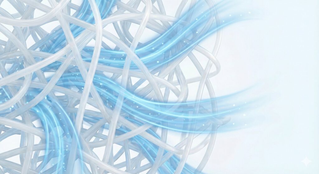 エアウィーヴの中身は、スポンジでもバネでもありません。「エアファイバー®」と呼ばれる、極細のポリエチレン樹脂繊維を3次元状に複雑に絡み合わせたものです。