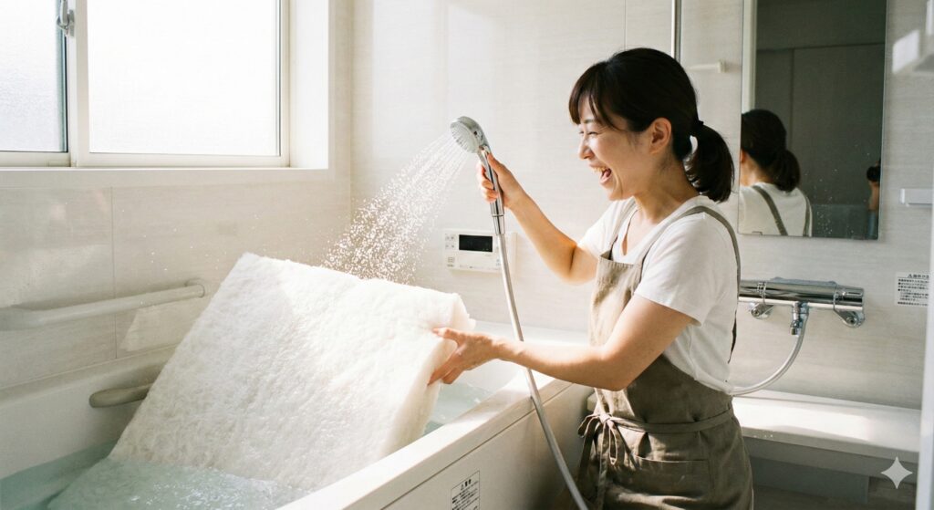 (画像挿入: [画像2: エアウィーヴを洗っているシーン])