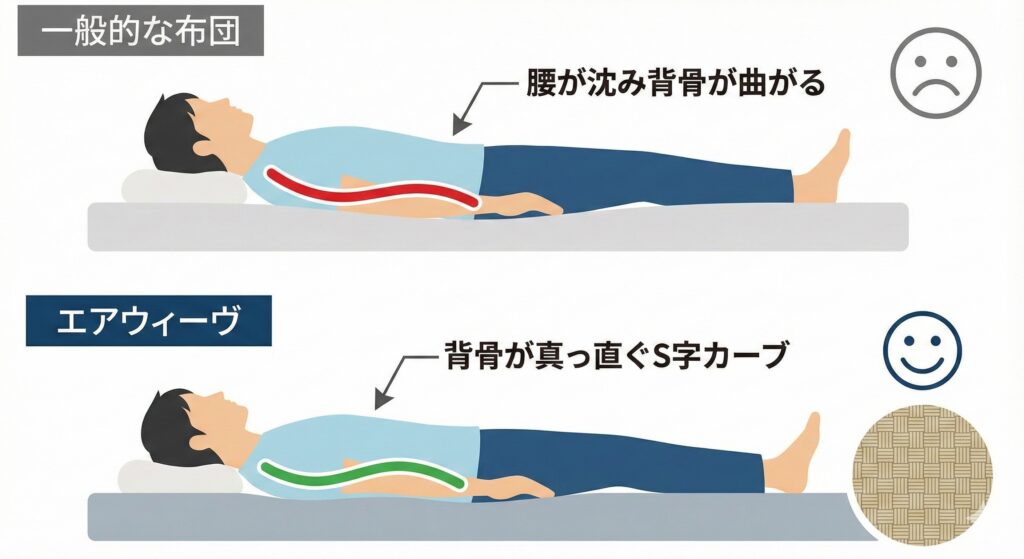 普通の布団で寝ると、重い「腰」や「尻」だけが深く沈み込み、「くの字」の姿勢になりがちです。これが腰痛の主原因です。