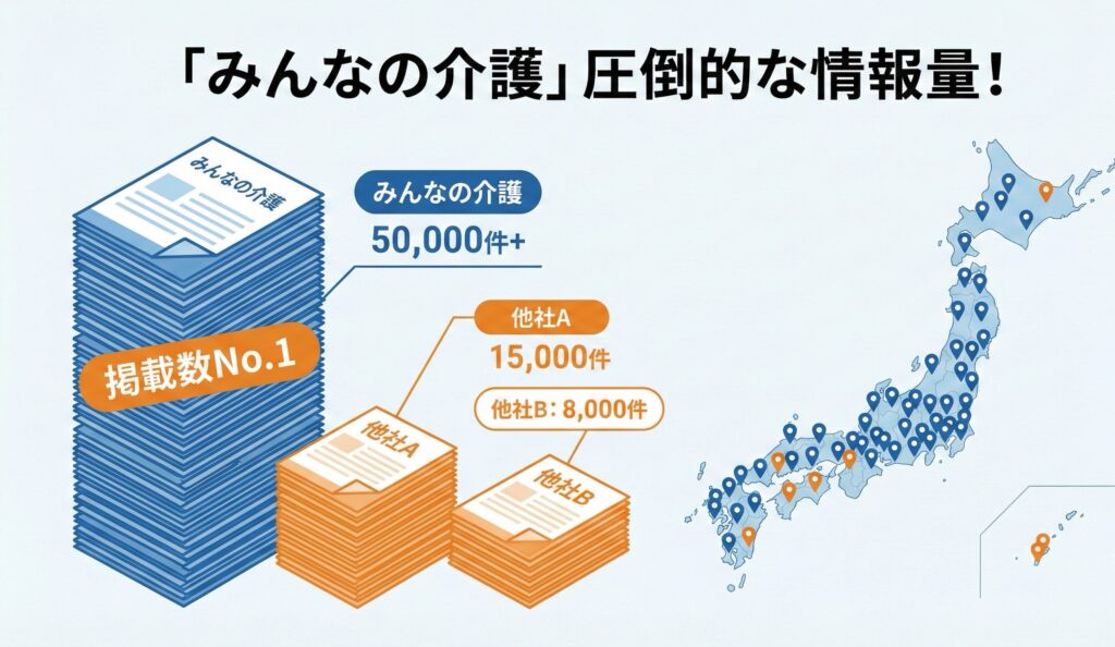 「みんなの介護」は、掲載数No.1(5.8万件超)の圧倒的な情報量と、VR見学などの独自機能を持つ、2025年現在「最も使うべき」介護施設検索サイトです。