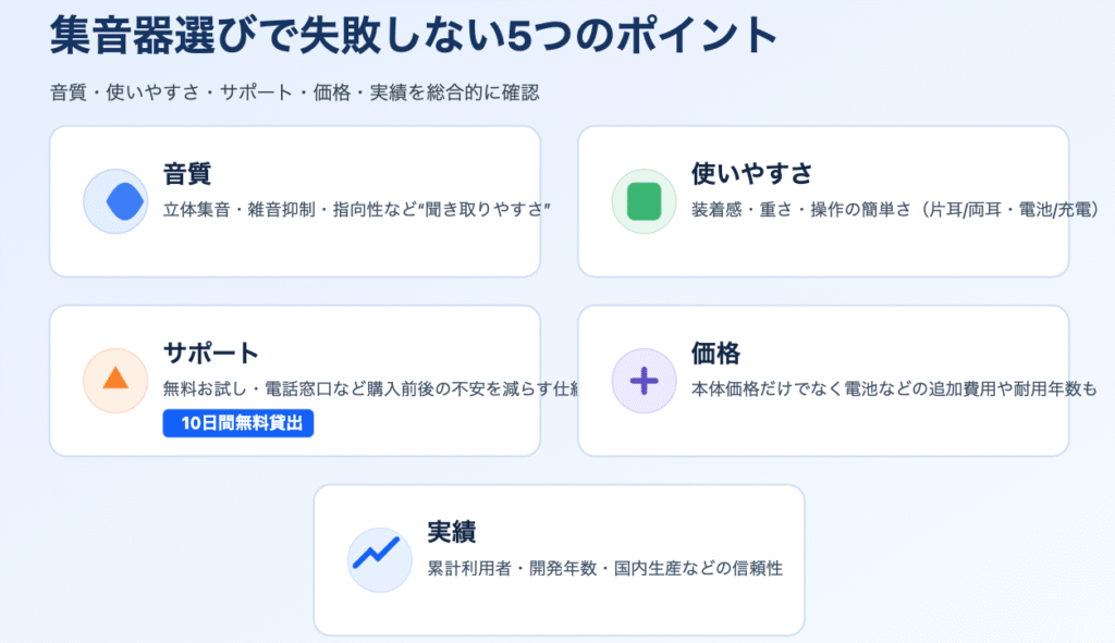 集音器選びは音質・使いやすさ・サポート・価格・実績の5つで大きく満足度が変わります。