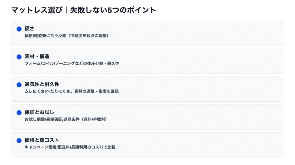 - 比較は「価格×技術×保証」の3軸で。バランス重視ならエマスリープ。
